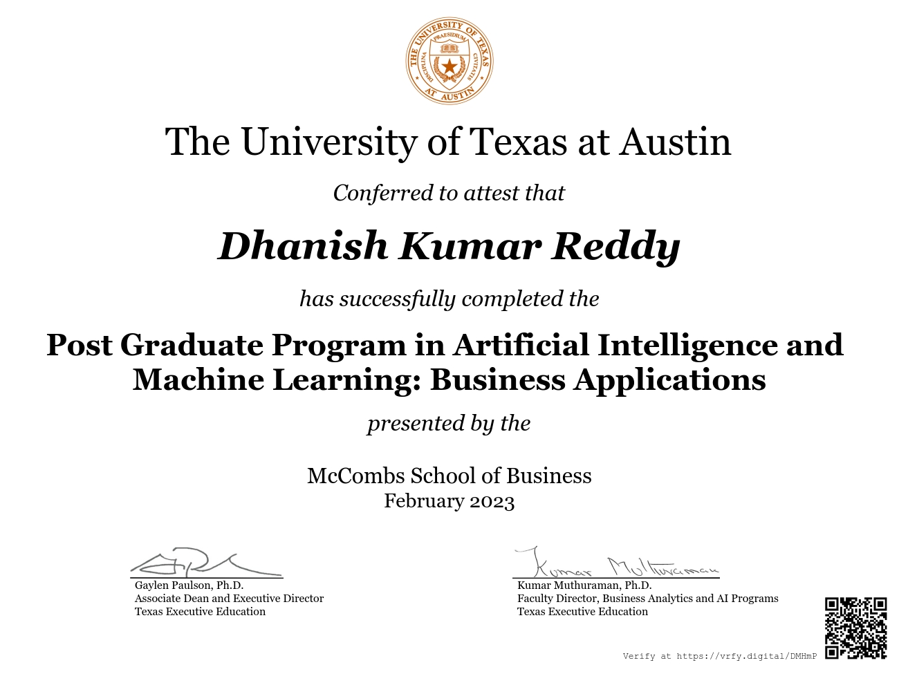 This certificate is awarded to Dhanish Kumar Reddy for the successful completion of Post Graduate Program in Artificial Intelligence and Machine Learning: Business Applications